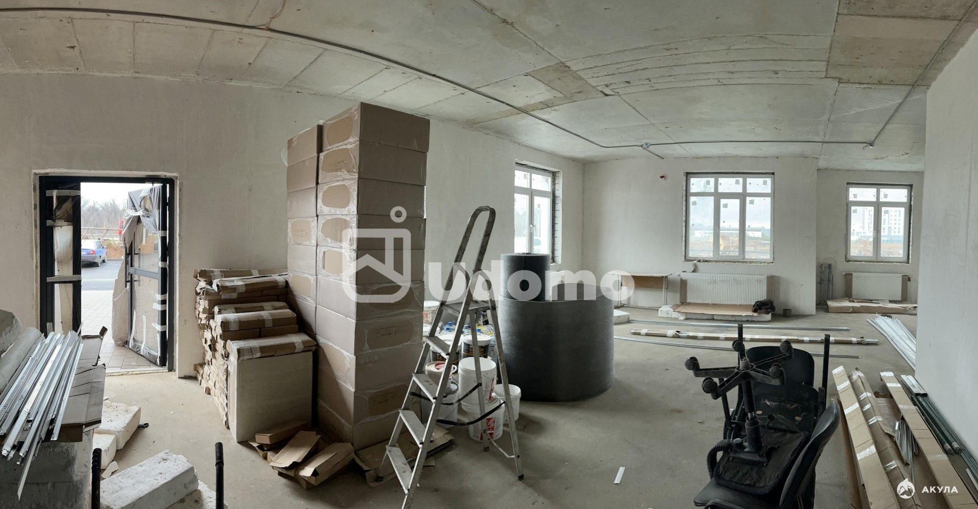 Полы стяжка, стены отштукатурены.