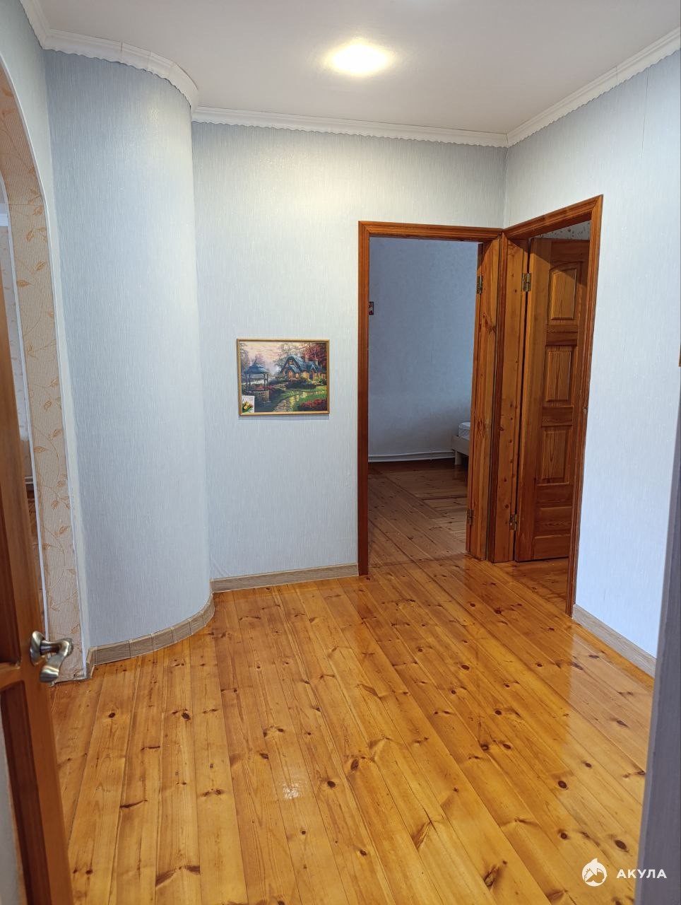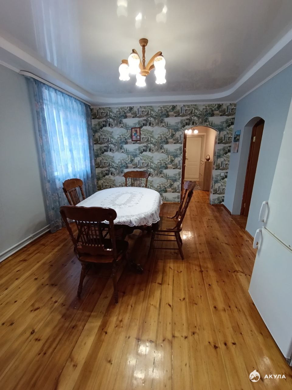 B дoмe прocтоpнaя кухня-cтoлoвая, две спальни, зал, пpихoжие, coвмeщенный cанузел. Потолок в зале и кухне - натяжной. Все полы деревянные лакированные, санузел - в кафеле. Два обогревателя на кухне и в ванной комнате. Мебель частично остается.
