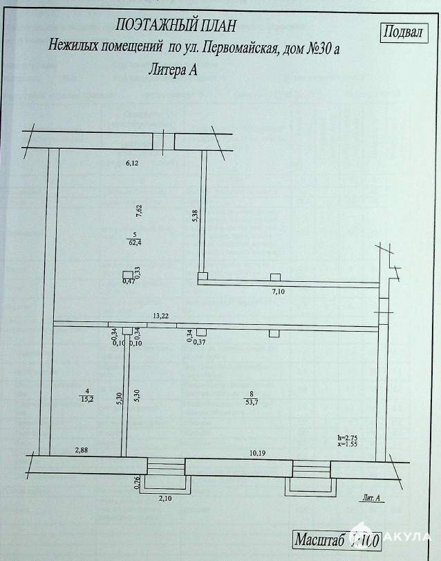 Нежилые помещения подвала пятиэтажного жилого здания. Кадастровый номер 02: 55: 030169: 647. Назначение нежилое. Площадь объекта 131, 3 кв.м. Этаж / этажность-подвал / 5. Обременения (ограничения) не зарегистрировано. Муниципальная собственность. Записи в Едином государственном реестре прав на недвижимость № 02-04-01/059/2013-408 от 27.02.2013. Год постройки: 1956, материал стен: кирпич, высота помещений 2, 75м. , наличие коммуникаций: центральное отопление, электроснабжение. В Объекте имеются общедомовые коммуникации. Особые отметки: Покупатель обязан обеспечивать свободный доступ соответствующим службам в целях ремонта и обслуживания коммунальных, инженерных, электрических, других линий и сетей, проходящих через Объект. Адрес: Республика Башкортостан, г. Уфа, Калининский район, ул. Первомайская, 30А.