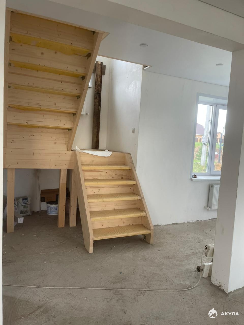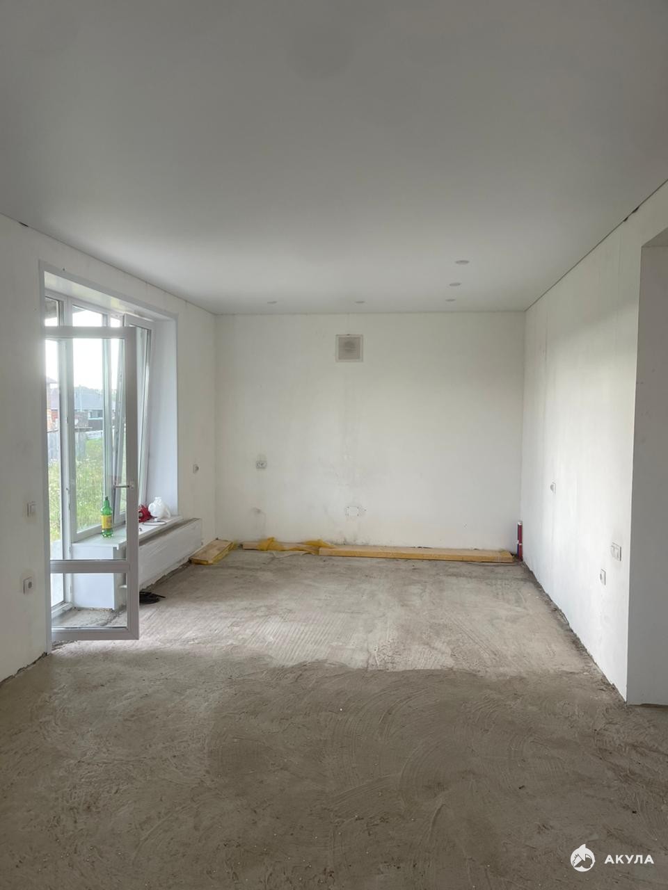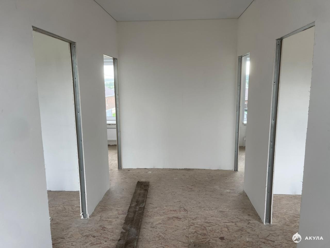 Стены везде оштукатурены по маякам , зашпаклеваны, готовы для поклейки обоев или покраски. На первом этаже полусухая стяжка с теплыми полами.