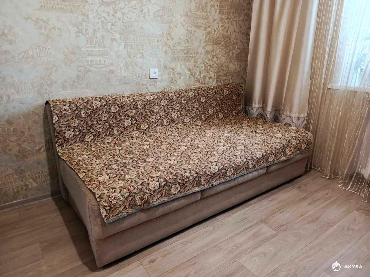 В квартире будущим покупателям остаётся: кухонный шкаф, диван, зеркало, люстры, гардины.