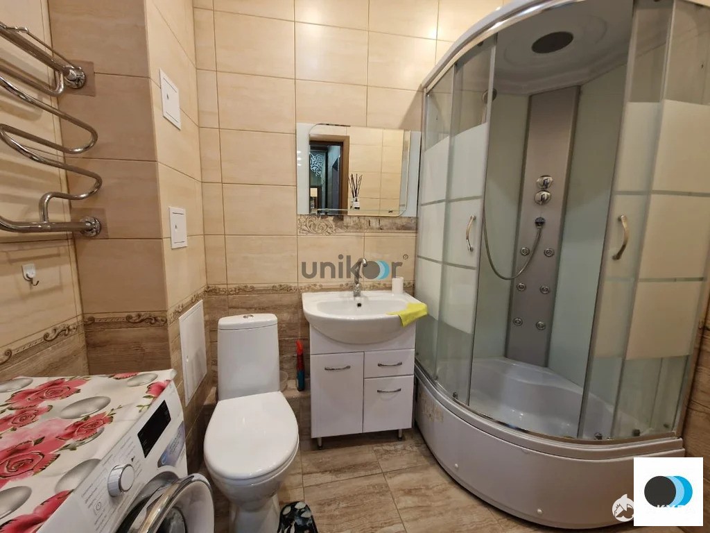 Кухонный гарнитур с глянцевыми фасадами. В прихожей шкаф-купе с зеркалом. Ванная просторная с большой душевой кабиной с функцией парогенератора. В комнате установлен кондиционер на два режима: тепло и холод.