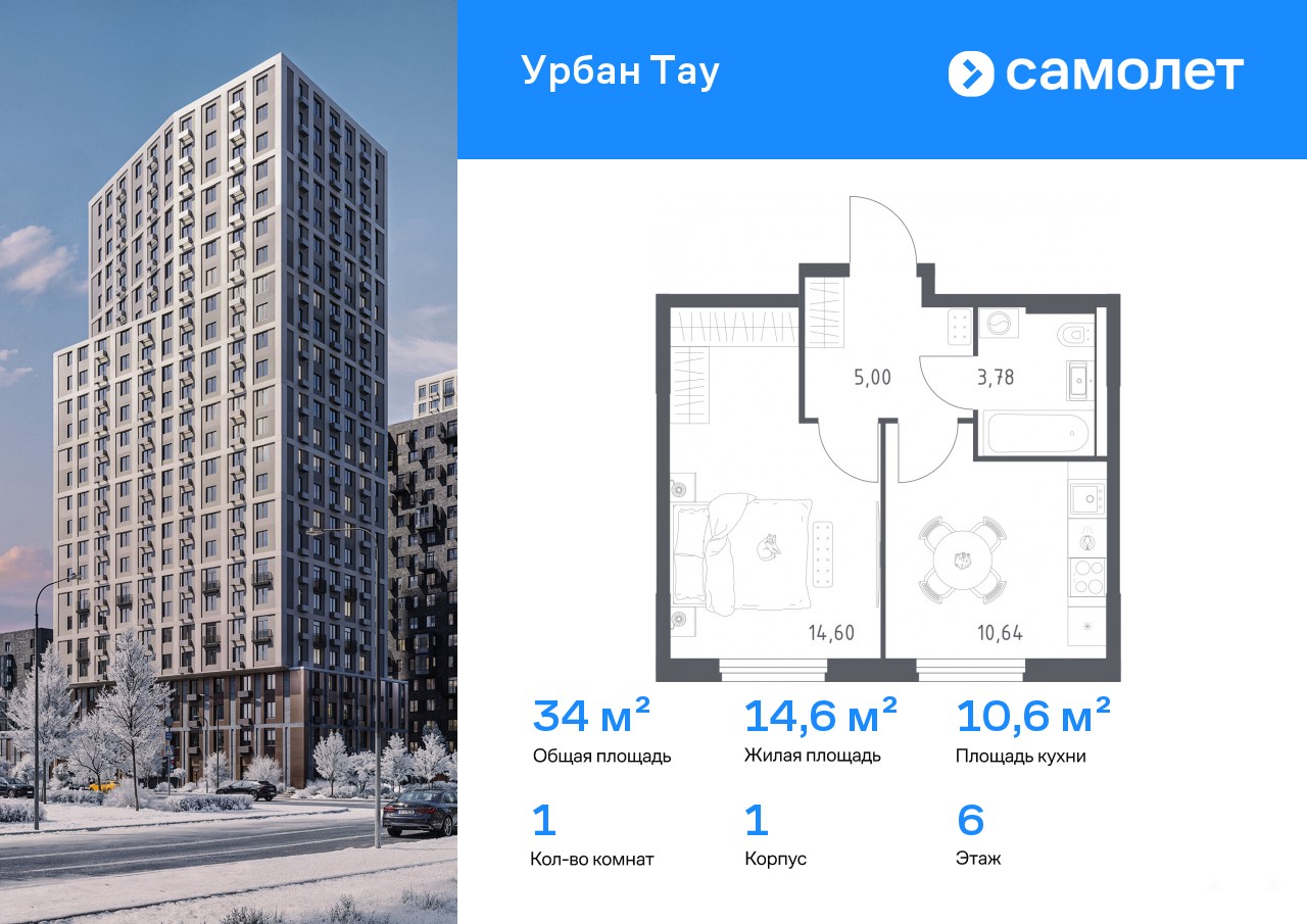 Строим кварталы для жизни с заботой о будущем. Предлагается 1-комнатная квартира комфорт-класса 34, 02 кв.м в корпусе 1 на 6 этаже, в ЖК «Урбан Тау»