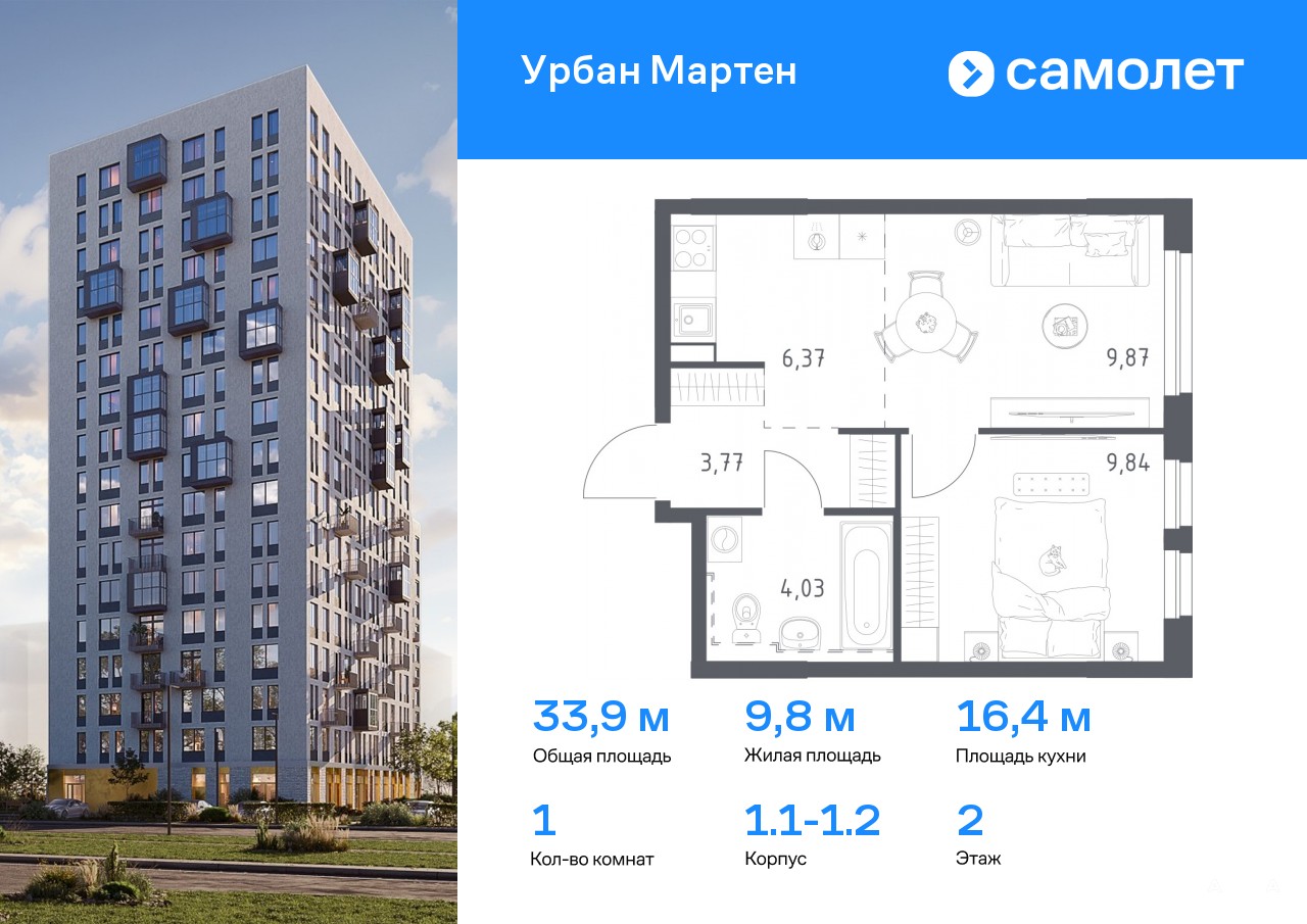 Предлагается 1-комнатная квартира комфорт-класса 33, 88 кв.м в корпусе 1.1-1.2 на 2 этаже, в ЖК «Урбан Мартен»