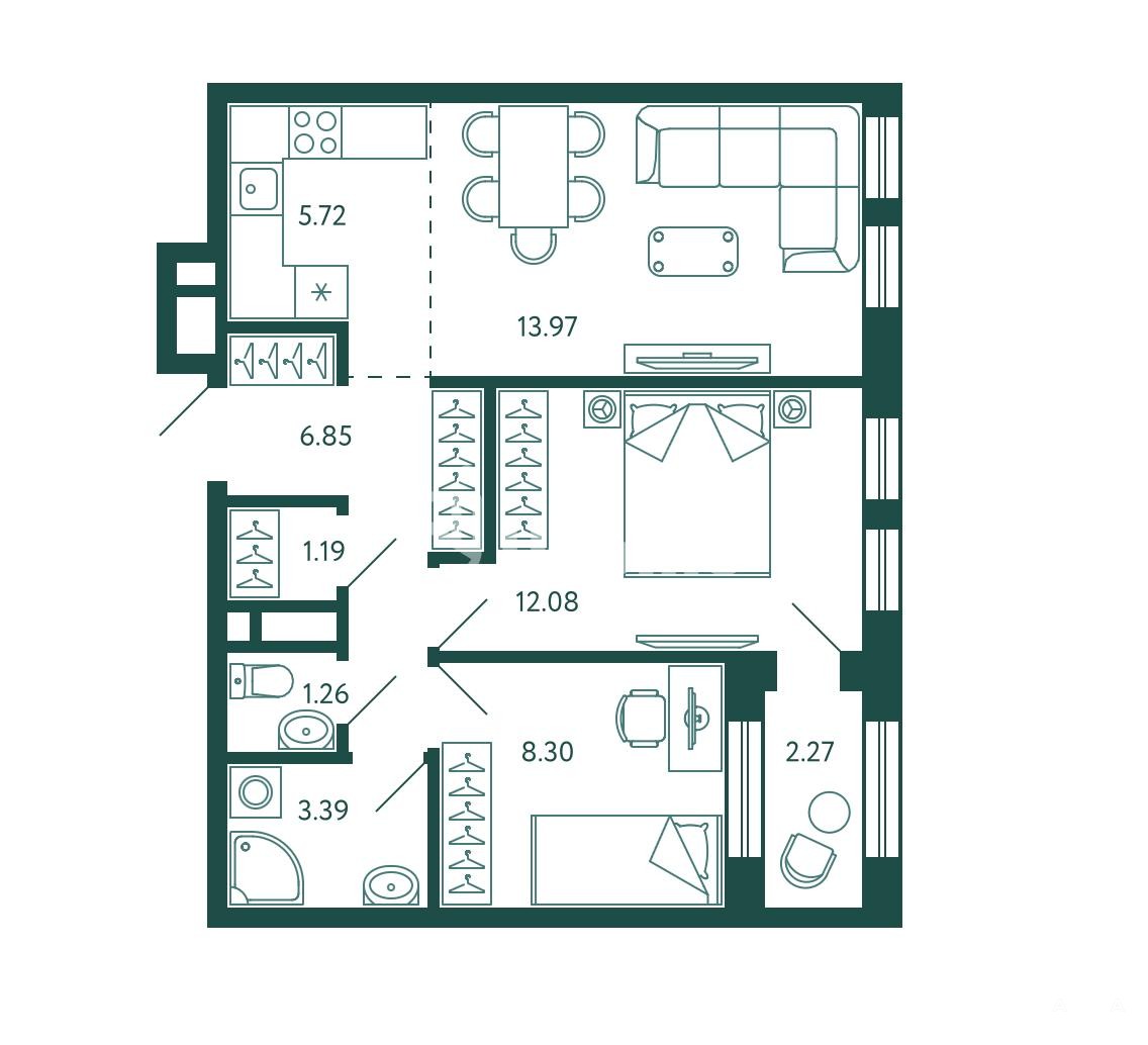 Приобрети оптимальную по площади 2к-смарт квартиру с шикарными видовыми характеристиками, мастер-спальной, лоджией и небольшой гардеробной комнатой.