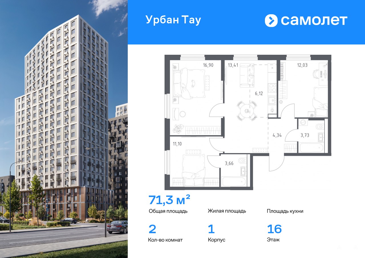 Строим кварталы для жизни с заботой о будущем. Предлагается 3-комнатная квартира комфорт-класса 71, 29 кв.м в корпусе 1 на 16 этаже, в ЖК «Урбан Тау»