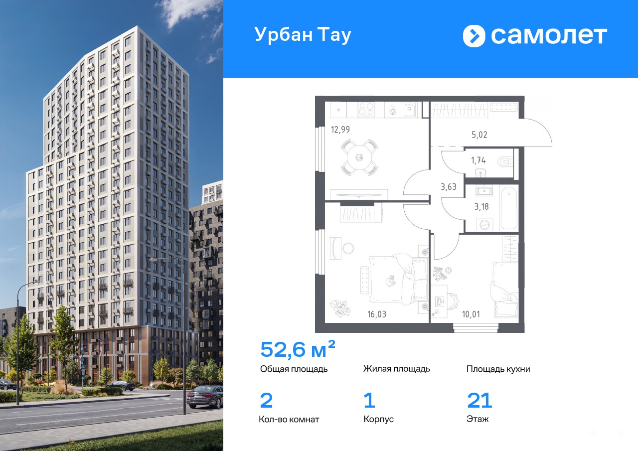 Строим кварталы для жизни с заботой о будущем. Предлагается 2-комнатная квартира комфорт-класса 52, 6 кв.м в корпусе 1 на 21 этаже, в ЖК «Урбан Тау»