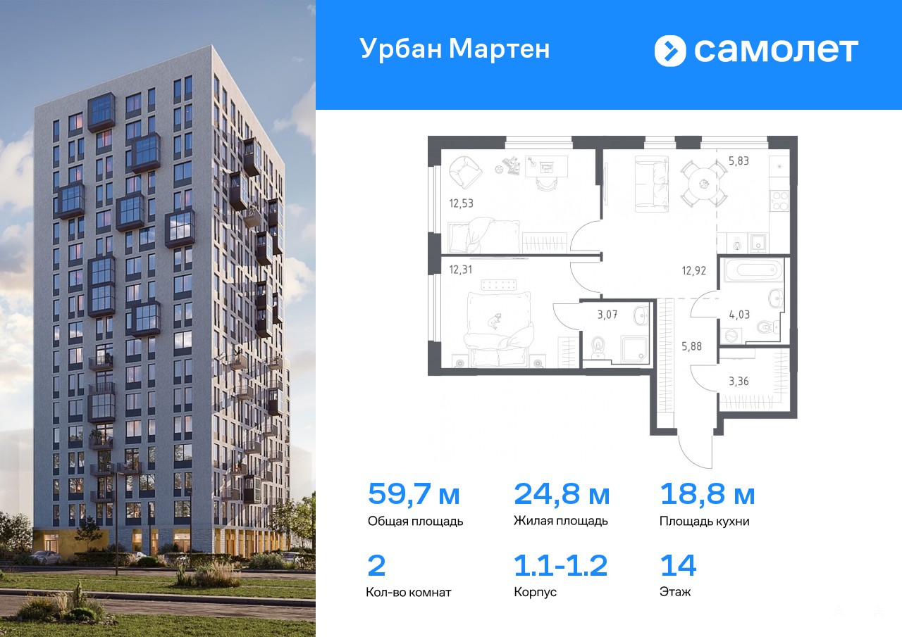Строим кварталы для жизни с заботой о будущем. Предлагается 2-комнатная квартира комфорт-класса 59, 93 кв.м в корпусе 1.1-1.2 на 14 этаже, в ЖК «Урбан Мартен»