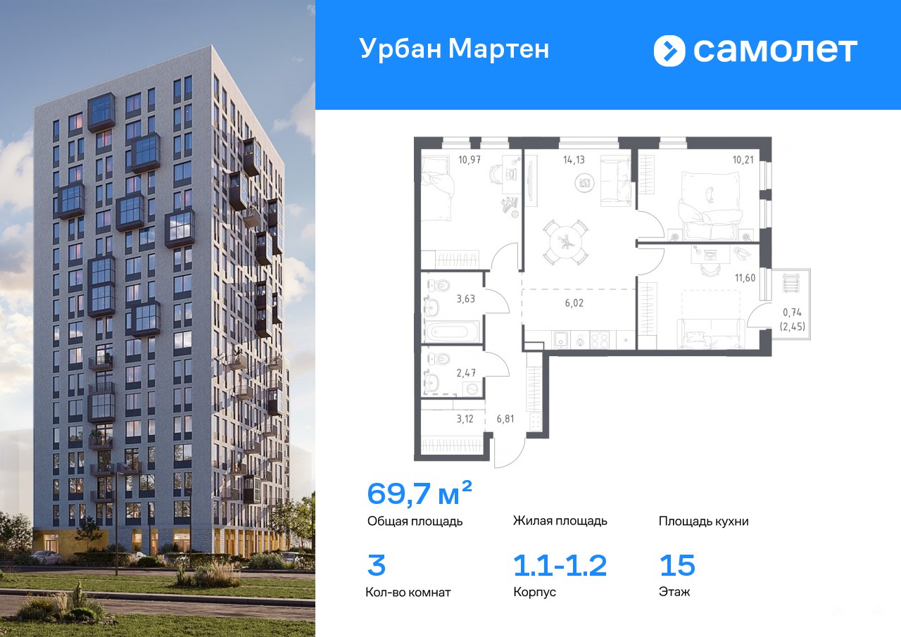 Предлагается 3-комнатная квартира комфорт-класса 69, 7 кв.м в корпусе 1.1-1.2 на 15 этаже, в ЖК «Урбан Мартен»