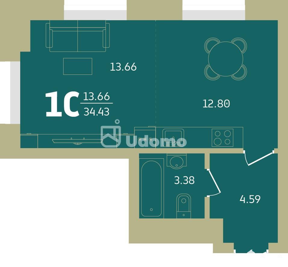 ● общая площадь - 34, 4 кв.м