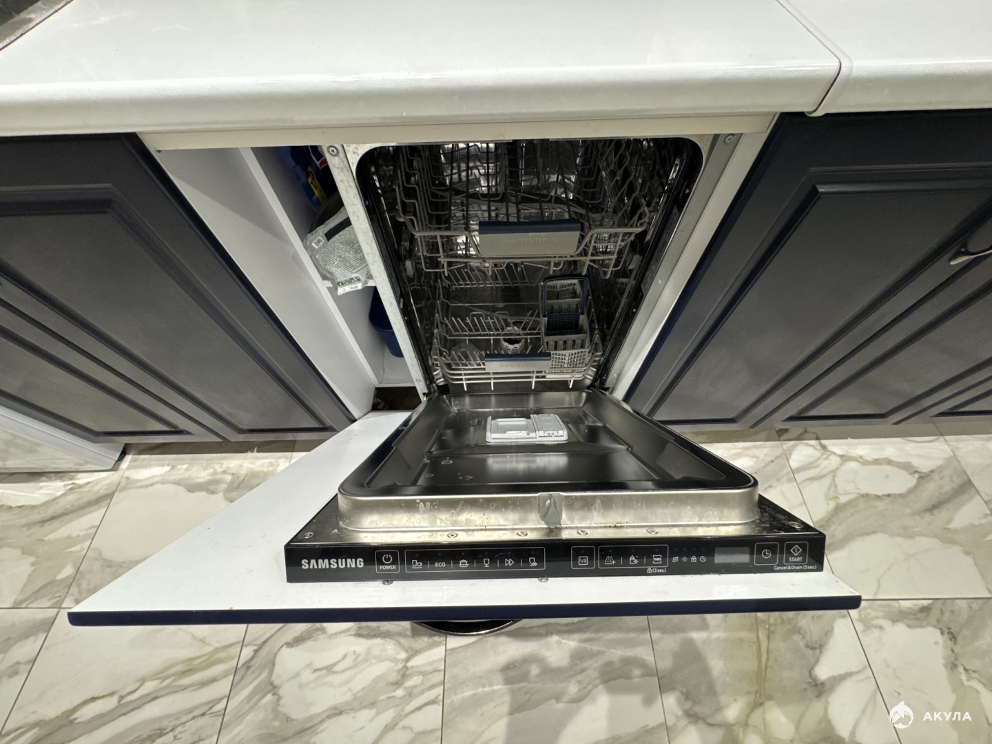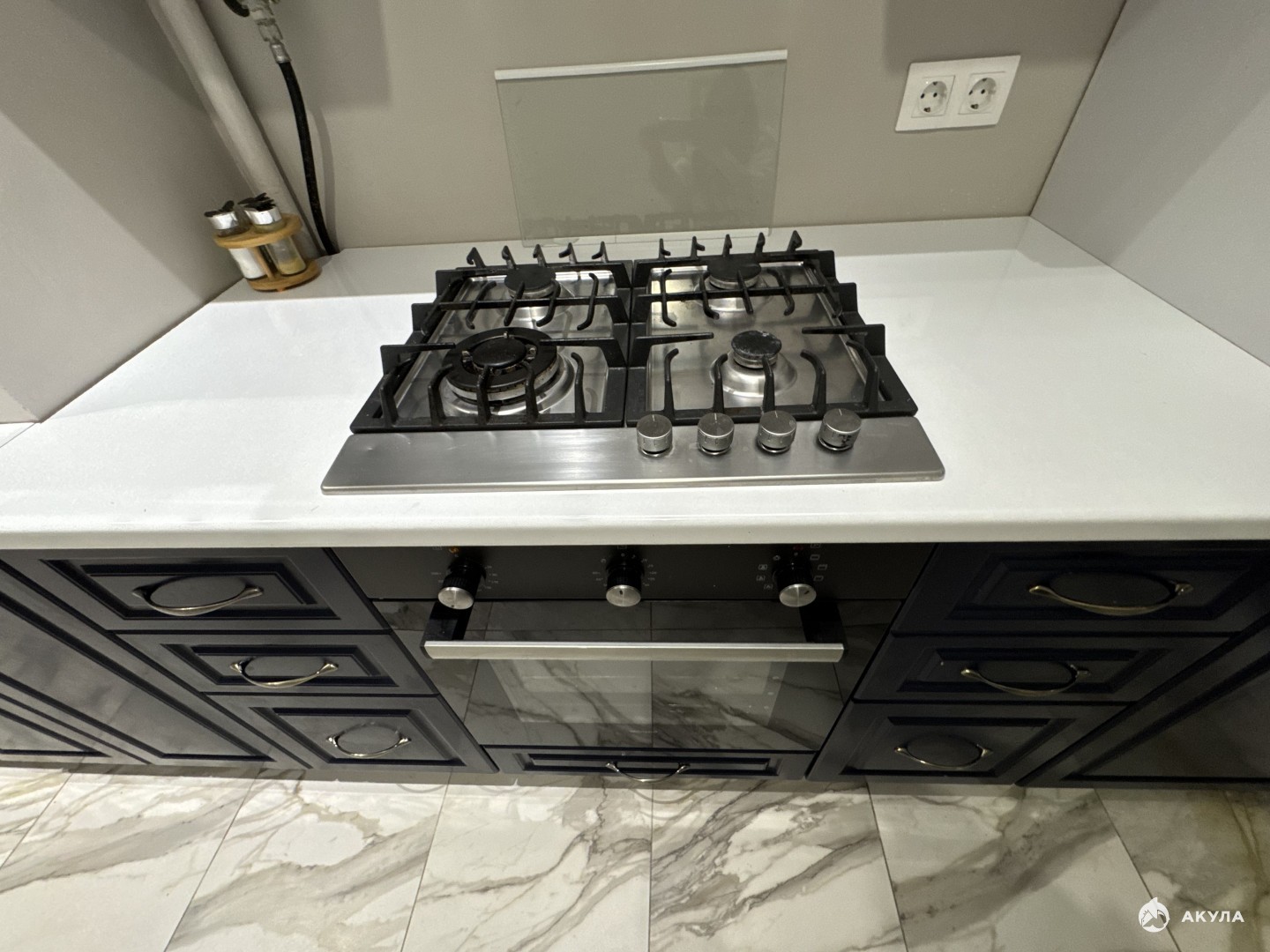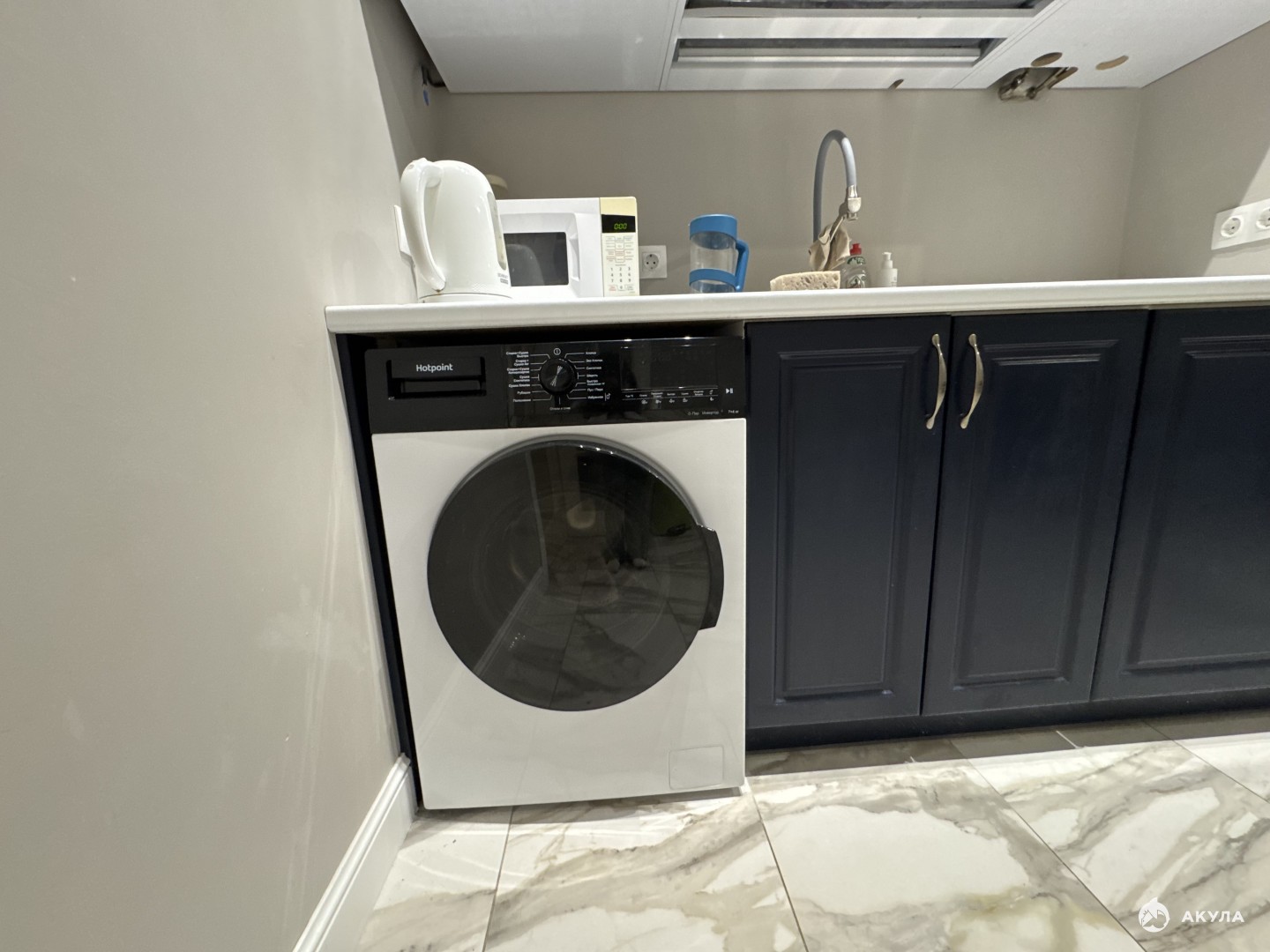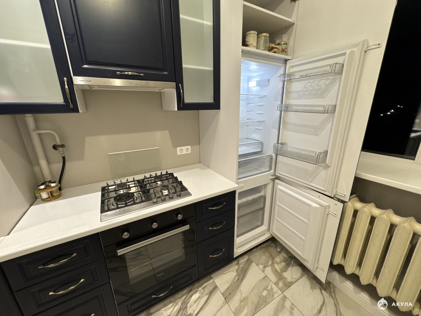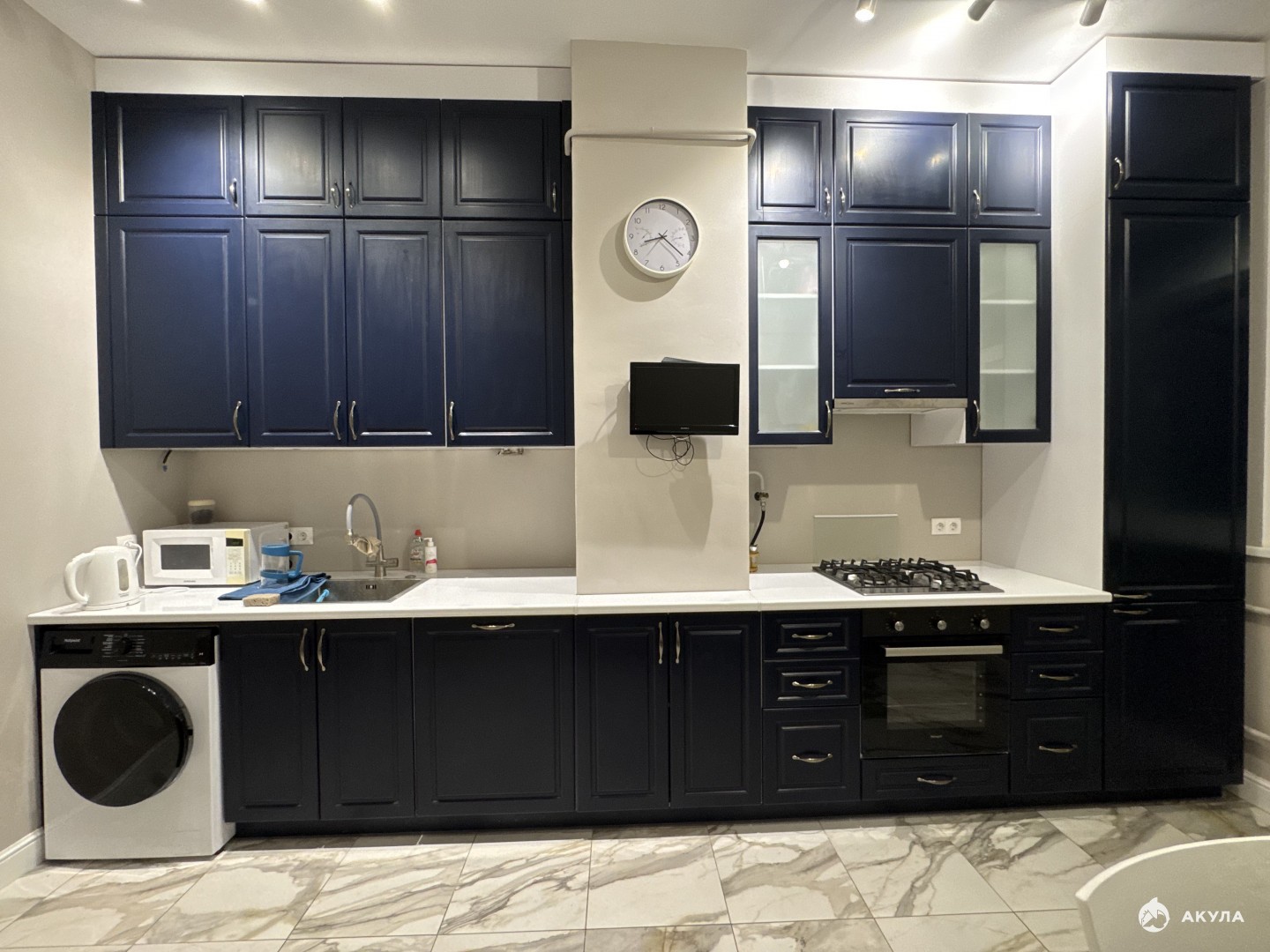 Техника: холодильник, плита газовая, вытяжка, микроволновая печь, стиральная машина, посудомоечная машина, чайник, телевизор, кондиционер.